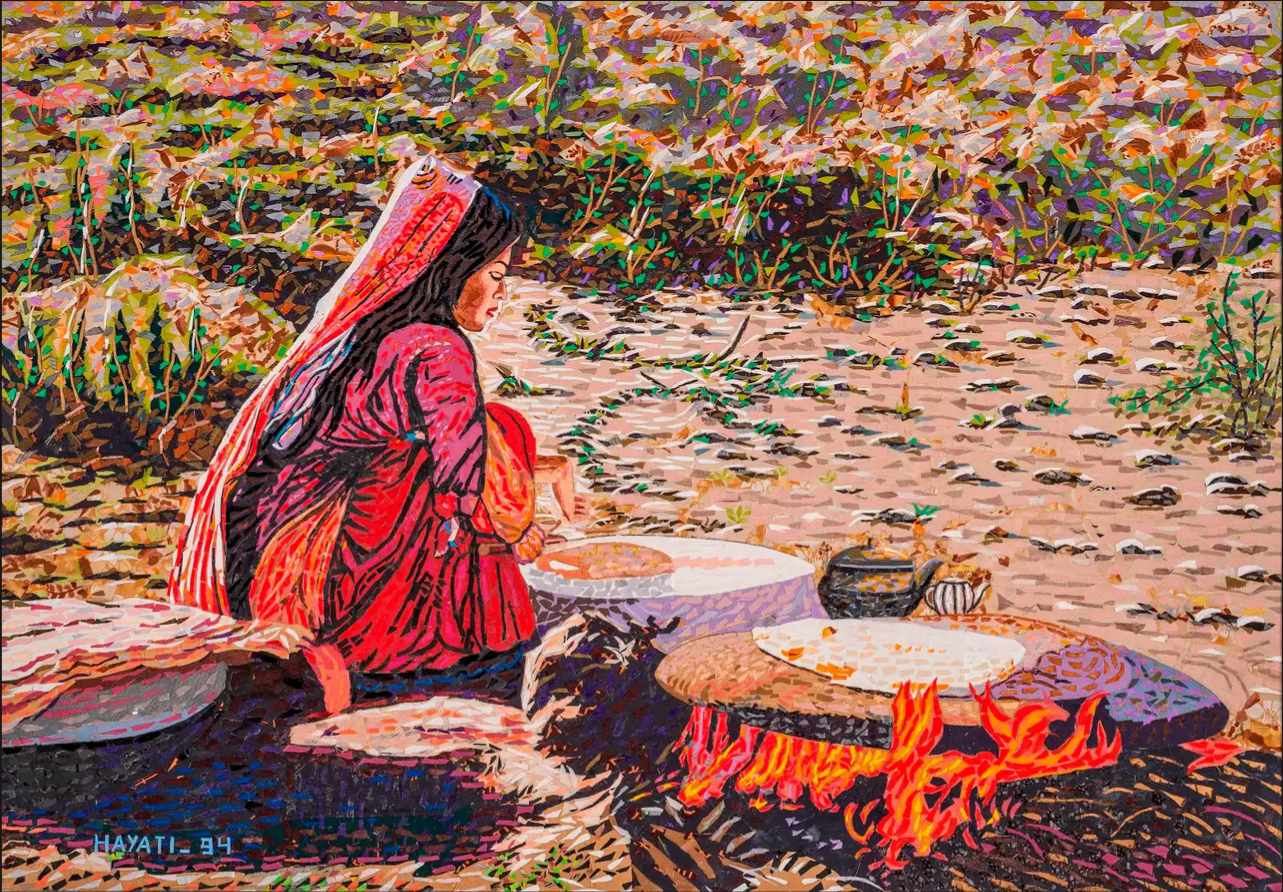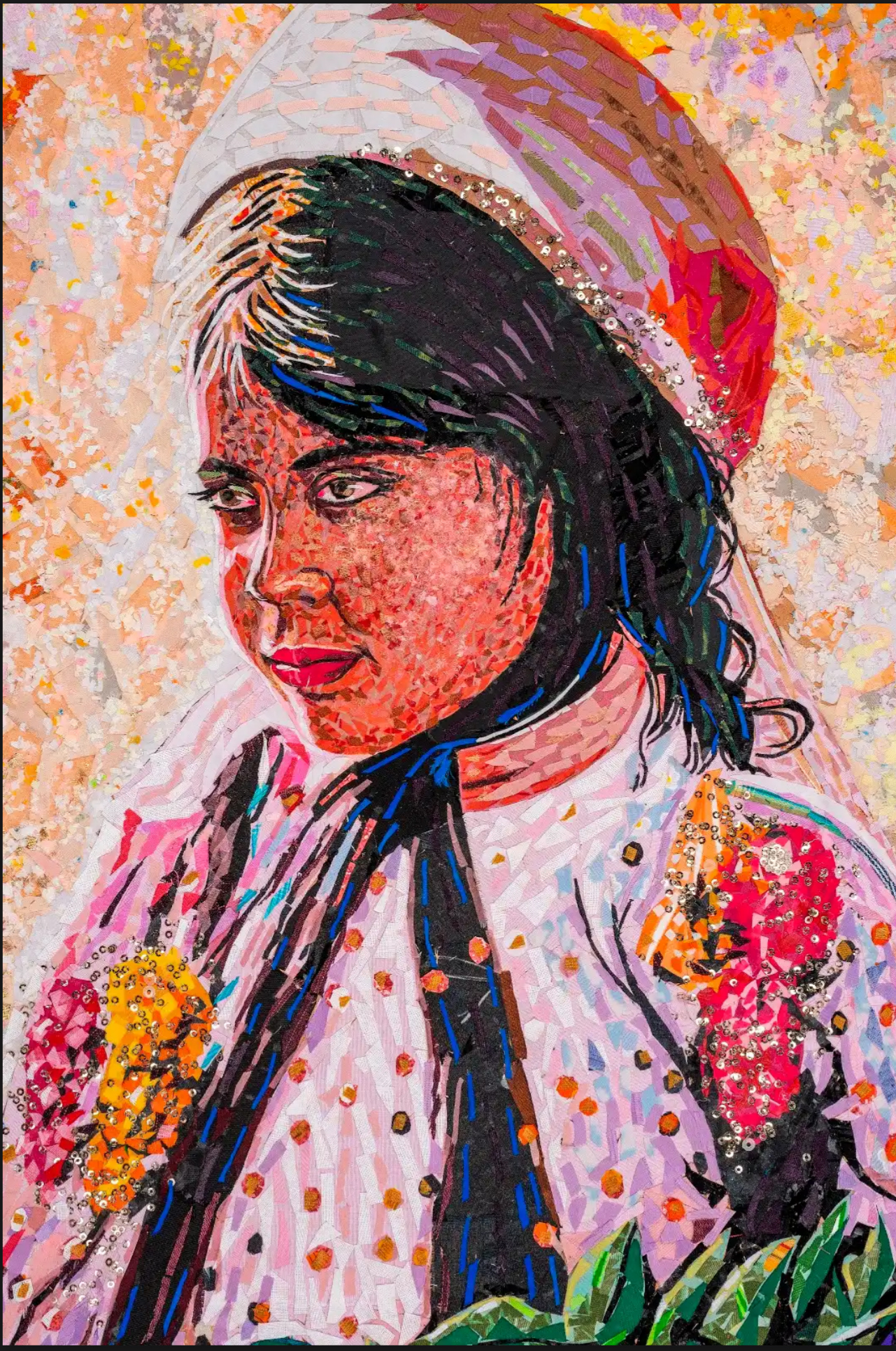 Her tools are cloth and tweezers (for taking very small and centimeter pieces of cloth), scissors in different sizes and shapes, and a spatula, handmade herbal glue, and a 3 mm MDF board. The most important features of her works include avoiding the use of chemicals and metal and the first plane of the work and the used fabrics and glue are all made of plant fibers and they do not harm the nature.